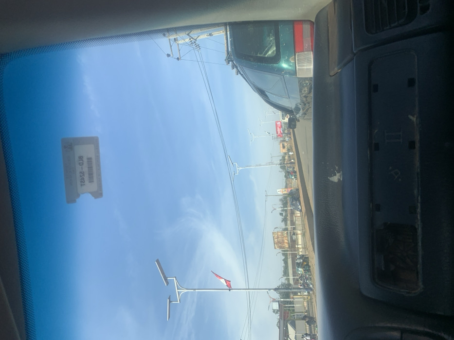 View from a car windshield. A green vehicle is visible to the right. Outside, power lines and streetlights line the street. A red and white flag flutters from a streetlight. Buildings and other vehicles are in the background. A parking permit sticker is stuck to the windshield. Part of the car's interior, including a dashboard, is in view.