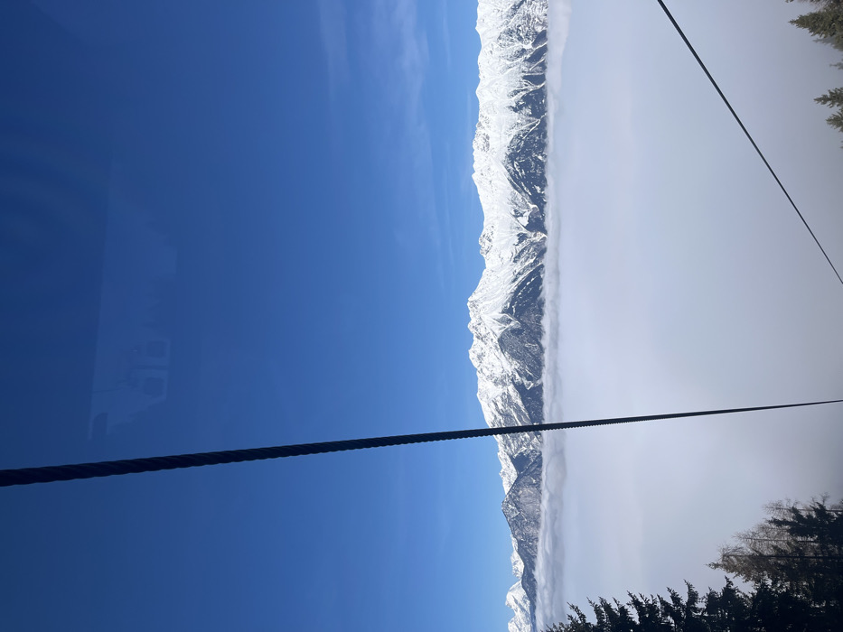 The image presents a daytime alpine scene captured from an elevated position, consistent with a gondola lift ascending above Innsbruck, Austria
