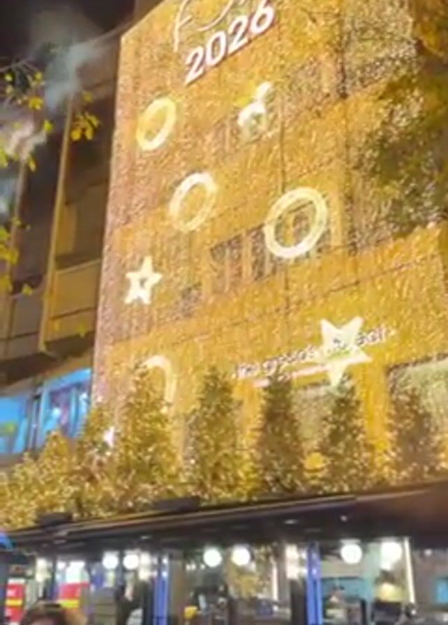 At night, a four-story building is illuminated with yellow lights. The top of the building displays the name "ATHENIAN FOLL 2026" in lights. Below this, several glowing shapes, including circles and stars, are visible. The ground floor features a restaurant with outdoor seating and small, lit Christmas trees. People can be seen walking around, dining at the restaurant, and standing near the camera. The overall atmosphere is festive.