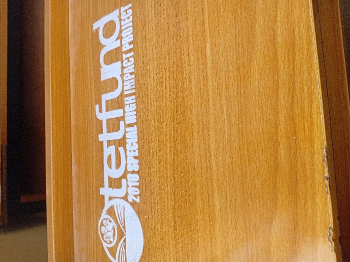 This image presents a close-up, angled overhead view of a light brown wooden surface, identified as being located in Kwazailewa, Nigeria. Printed or stenciled in white on the surface is a logo and text. The logo, positioned to the left, features a stylized design consisting of what appears to be an open book or multiple pages atop a landscape or field, partially enclosed by an arc or circle. To the right of the logo, the word "tetfund" is displayed in prominent white sans-serif letters, with "2018 SPECIAL HIGH IMPACT PROJECT" written in smaller white capital letters directly below it. The wooden surface exhibits visible grain patterns and signs of wear, most notably along its lower edge where the finish or laminate is chipped and peeling in multiple sections. The background is dark and out of focus, indicating an indoor setting with obscured structures or furniture behind the main wooden object. No individuals, actions, or specific interactions are visible within the frame.