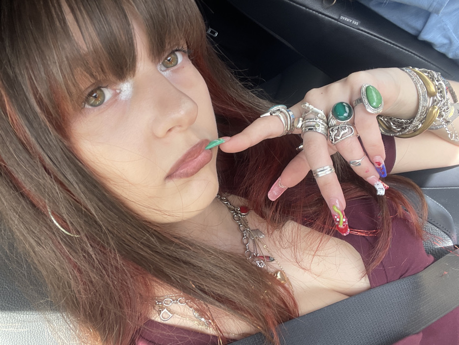 In Kfar Saba, Israel, a close-up, angled portrait depicts a female individual inside a vehicle. The subject, with dark brown hair featuring reddish highlights and bangs, has light brown/hazel eyes and wears makeup, including shimmering white on her inner eyelids. Her lips are slightly parted. She is wearing a dark reddish-purple top, with a dark seatbelt visible across her chest. Numerous silver-toned necklaces, including one with red heart charms and another with a padlock charm, are visible. A silver hoop earring is present on her left ear. Her right hand, raised with the index finger lightly touching her lower lip, is adorned with multiple silver-toned rings, many featuring prominent green stones, and several silver-toned bracelets on her wrist. Her fingernails are long and manicured with diverse art, including a green abstract design on the index finger, red with yellow-green elements on the ring finger, and white with red/blue accents on the pinky finger. The background consists of dark car upholstery, and an "SRS AIRBAG" label is partially visible on the right. Natural light illuminates the scene from the left.