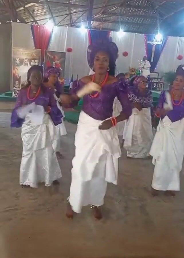 group of women dancing in what appears to be a church or community hall. They are dressed in matching purple lace tops, white wrappers, and headwraps. All of them are barefoot. The women are performing synchronized movements, waving white cloths in their hands as part of the dance. The hall has a corrugated metal roof and a simple concrete floor. In the background, there's a stage area with decorations, including fabric drapes and what looks like a framed image or poster. There is also a man standing on the stage. The camera remains relatively stable.