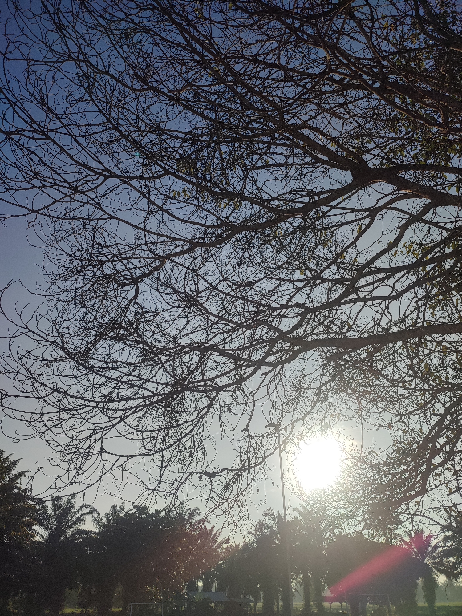 The image captures a sunlit scene in Blangriek, Indonesia, featuring bare tree branches against a blue sky. The sun, positioned in the lower center, creates a bright glare. Below the trees, a line of palm trees and other foliage is visible, partially obscured by the sunlight. A structure, potentially a shelter, is also faintly discernible among the trees. No people are visible in the image.
