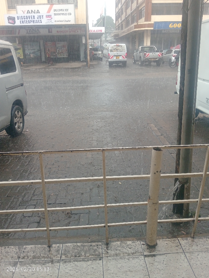 This image depicts a street scene in Nakuru, Kenya, during a heavy rainfall event, captured on February 20, 2026, at 15:13