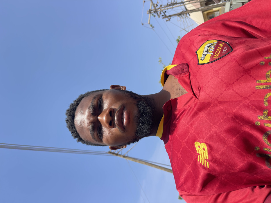 An outdoor, mid-shot portrait depicts an adult male positioned centrally against a clear, bright blue sky in Zaria, Nigeria. The individual has dark skin, short dark hair, and a dark beard, and is looking directly at the camera. He is wearing a red short-sleeved sports jersey with a yellow-trimmed collar. The jersey features a yellow "New Balance" logo on the left chest and the "ROMA 1927" football club crest on the right chest, which depicts the Capitoline Wolf. Yellow text, likely a sponsor, is partially visible at the bottom of the jersey. Overhead utility poles and wires are visible in the background on both the left and right sides of the frame, indicating an urban or semi-urban environment under direct sunlight.