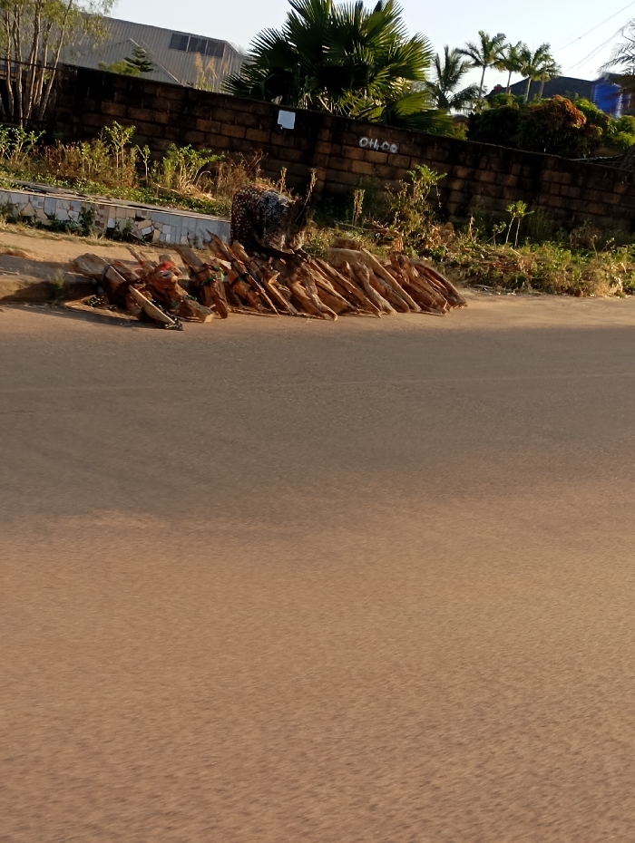 The image depicts a roadside scene in Barakin Lerawi, Nigeria. In the foreground, a wide, light brown asphalt road surface extends across the lower two-thirds of the frame, appearing textured and slightly blurred. On the immediate right side of the road, a dirt shoulder is visible, upon which a large quantity of cut timber logs or branches is stacked horizontally, forming an elongated pile. These logs vary in size and length, with some appearing bundled together by green and red ties. To the left of the log pile, a substantial dark, textured, possibly woven bundle or sack stands upright on the roadside. Behind the stacked logs, a low, light brown brick or stone retaining wall runs horizontally across the midground. White characters, possibly "OH.CO," are visible graffitied on the wall, and a small, square dark object, possibly a sign, is affixed to the wall further left. Behind the wall and on an elevated embankment, dense green vegetation, including shrubs, grasses, and several small trees, grows upwards. Dominating the upper midground directly behind the logs is a large palm tree with prominent fronds. Other palm trees are visible further to the right on the embankment. In the far background, on the upper left, industrial-style buildings with gray or metallic roofs are discernible beneath a clear, light blue sky. The scene is brightly illuminated by natural light, casting minimal shadows. No individuals are present or engaged in any discernible action.