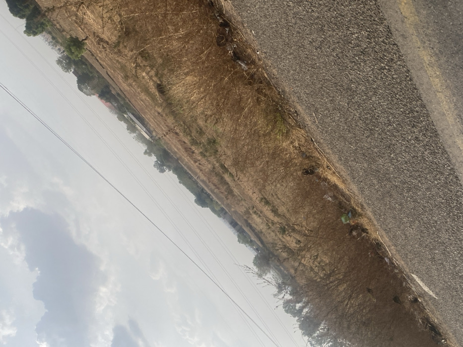 The scene is located in the city of Kwali, Nigeria. The image is captured at an oblique angle, depicting a semi-rural landscape under an overcast sky. In the foreground, an asphalt road with a visible yellow demarcation line on its right edge runs diagonally from the lower left to the mid-right of the frame. Adjacent to the road, the ground is covered with dry, golden-brown grasses and sparse shrubs, interspersed with visible refuse including plastic items. Beyond this roadside vegetation, an expansive, uncultivated field of similar dry vegetation stretches towards the horizon. In the mid-ground and background, scattered green trees are visible, along with several indistinct building structures, some with visible roofs. Multiple thin power lines traverse the upper half of the frame against a pale, cloudy sky. No individuals or specific activities are present within the frame.