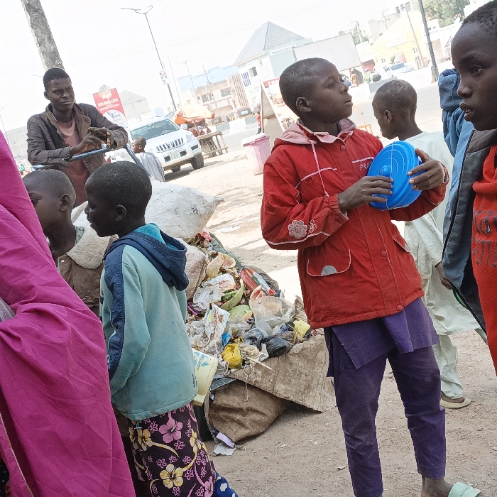 The scene depicts an outdoor street-side area in Kawaji, Nigeria, under daylight conditions. Multiple individuals, primarily children, are present around a substantial pile of mixed refuse. In the foreground, a boy wearing a red jacket over a light-colored undershirt and purple trousers stands facing right, holding a blue plastic bowl in both hands. To his immediate right, the upper torso and head of another child in a red garment are partially visible. To the left of the boy in red, a younger boy in a light blue hooded sweatshirt and a dark floral-patterned skirt or trousers looks left. His figure is partially obscured on the far left by a large section of magenta fabric. Further left, partially obscured, is another child with a brown collar visible. Behind these children, an irregular mound of refuse consisting of plastic bags, organic waste, and various debris is accumulated on the ground. Behind this refuse, an adult male in a brown jacket and a light red shirt leans against a pole or an unseen object, looking towards the left side of the frame. A white SUV is visible on a paved road in the mid-ground, with other indistinct vehicles and buildings lining the street in the distance. The ground surface appears to be unpaved dirt in the immediate foreground, transitioning to a paved road. The sky is bright and clear.
