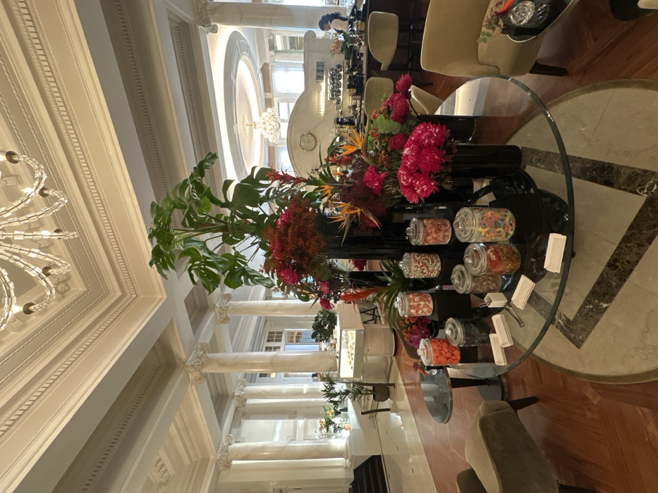 This image depicts the opulent lobby lounge of the Beau-Rivage Palace hotel in Lausanne, Switzerland. The scene is dominated by a large, round glass-topped table in the foreground, featuring a central display of nine clear glass jars filled with colorful candies and confectioneries. White paper trays and serving tongs are provided on the table, indicating a self-service arrangement. Surrounding and intermingling with the candy display are multiple black vases holding large, vibrant floral arrangements, including tall green Monstera leaves, red and pink chrysanthemums, and various exotic flowers such as Birds of Paradise. The flooring in the immediate foreground consists of dark wood parquet, transitioning to a light-colored marble or tiled area with a dark geometric pattern beneath the central table. Two upholstered armchairs, one beige/taupe on the left and one light tan on the right, are partially visible, positioned around small dark tables, suggesting guest seating. In the midground to the left, a grand architectural section features multiple white, fluted marble columns with ornate capitals, supporting a high ceiling with intricate white molding and cornices. A polished wooden staircase leads upwards on the far left. A modern, white display case, possibly for pastries or desserts, is visible beyond the central table, along with additional potted plants. To the midground right, a contemporary bar or service counter with a curved white facade is visible, topped by a large, round white clock. Behind the counter, shelving stocked with bottles and glassware is apparent. Two light-colored, upholstered bar stools are positioned in front of the counter. A single individual, a staff member in a dark uniform, is partially visible behind the bar, attending to the area. The high ceiling throughout the space is adorned with multiple elaborate crystal chandeliers, providing overhead illumination. The overall environment conveys a sense of grandeur and luxury within a meticulously maintained interior space.