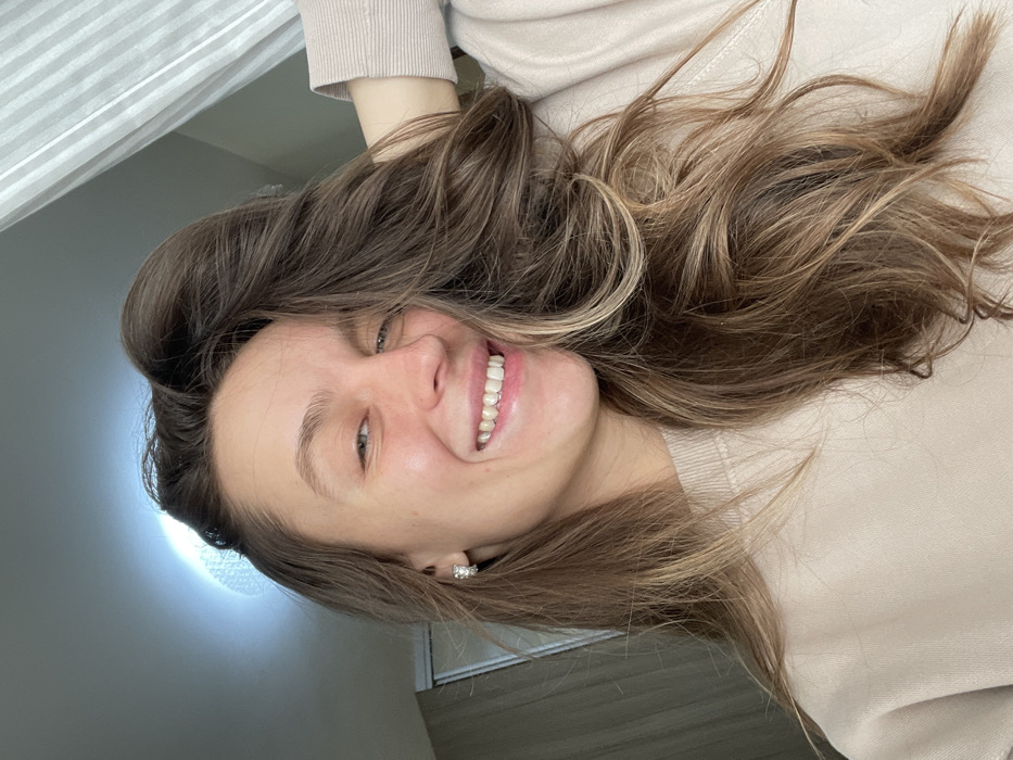 The image presents a close-up, chest-up indoor portrait of an adult female. She possesses long, wavy brown hair with lighter highlights, which cascades primarily over her right shoulder and chest. Her face is centered, exhibiting a broad smile that reveals her upper and lower teeth. Her eyes are open and directed slightly towards the viewer's left. She has a light skin complexion and wears a small, shiny earring in her visible left ear. The subject is dressed in a light beige or cream-colored crew-neck sweatshirt. Her right arm is raised, with her hand positioned behind her head, partially obscured by her hair. The background details indicate an indoor environment, featuring a bright, circular ceiling light fixture in the upper left. A section of a light-colored wardrobe or cabinet is visible on the left side, and striped curtains or blinds are present in the upper right, suggesting a window. The specific location within the city of Budva, Montenegro, cannot be identified from the visual data present in the image.