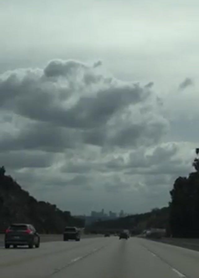 view from inside a car driving on a highway. The sky is overcast with thick, gray clouds. The highway has multiple lanes of traffic going in the same direction, with several cars visible in front of the camera car. Trees and hills line either side of the highway. In the distance, the skyline of a city can be seen. The dashboard of the car is visible at the bottom of the frame. The overall scene is somewhat gloomy due to the overcast sky.