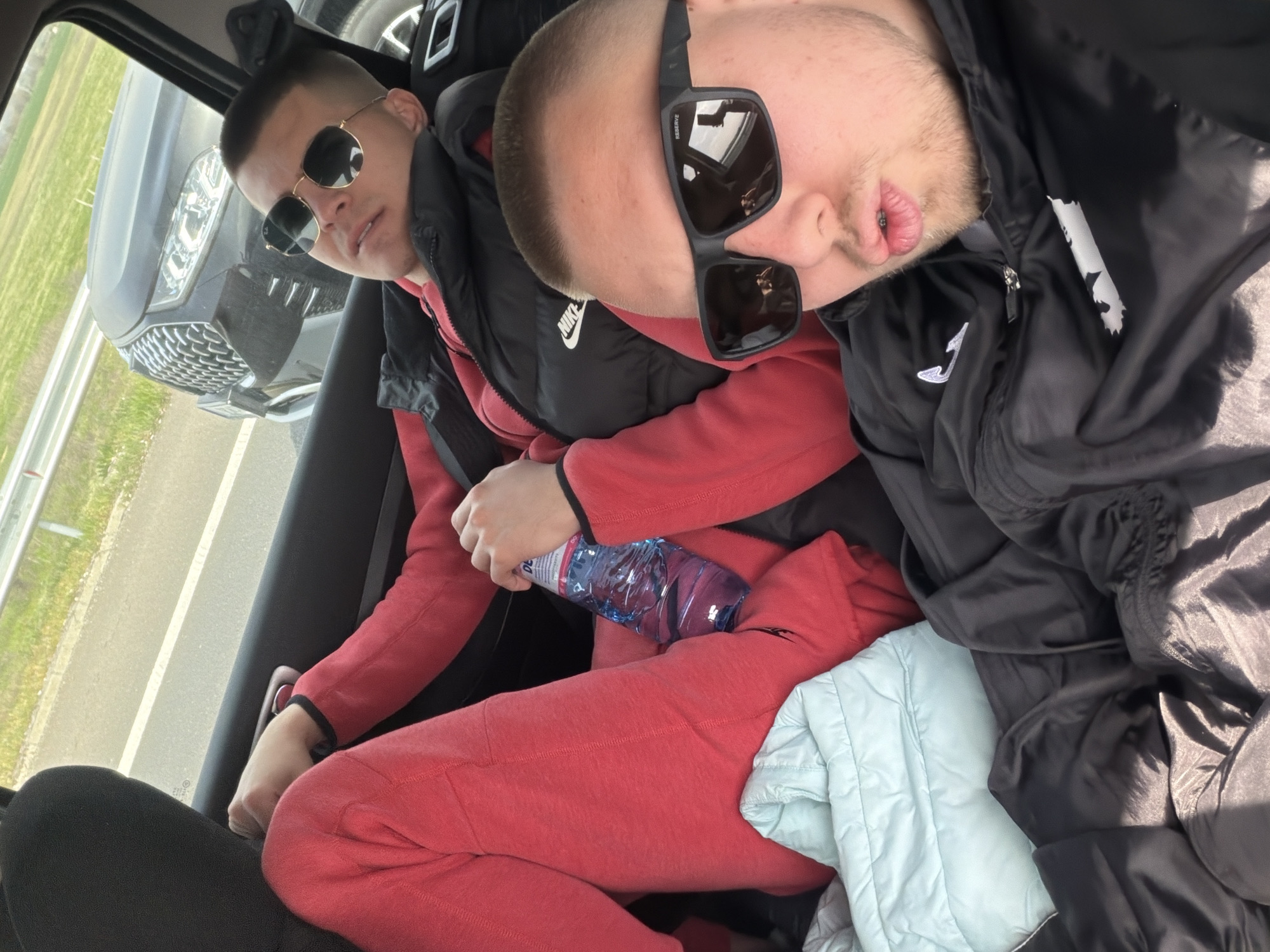 Two young men are in the passenger seat of a car. The location is Malo Konare, Bulgaria, as visible through the window. The man on the left wears a red sweatsuit, black vest, and sunglasses. He is holding the car door. The man on the right wears a red sweatsuit, black jacket, and sunglasses. He holds a water bottle and rests against a light blue jacket. A car is visible through the window.