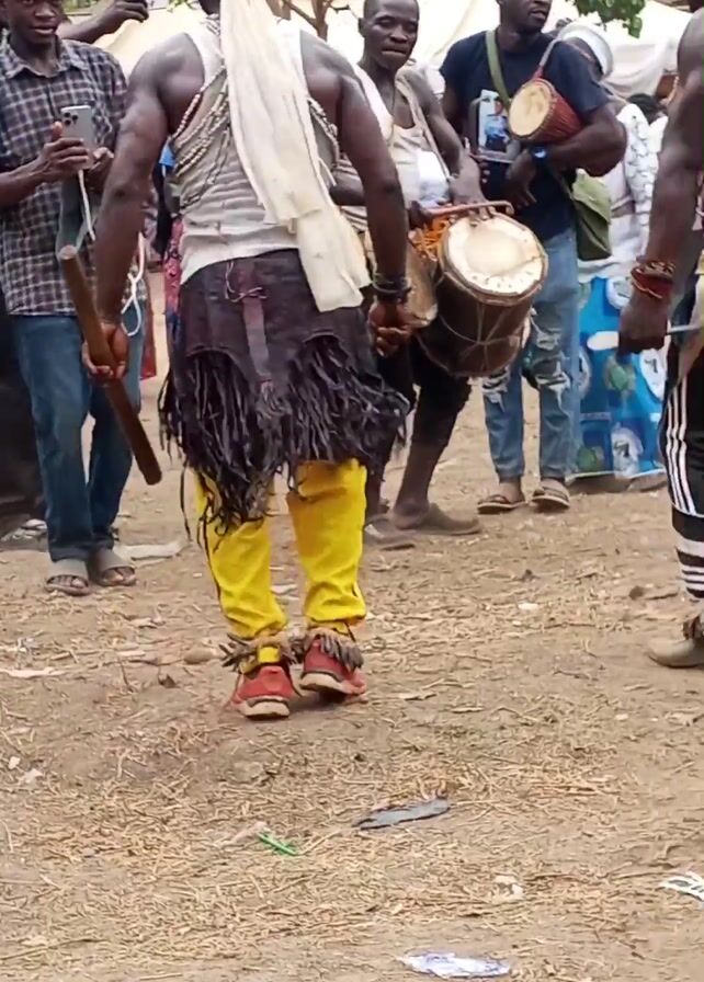 The video depicts a group of men dressed in traditional garb dancing in a dirt clearing. Some of the men are playing drums, while others carry staves and axes. One man in particular stands out; he has on a white tank top, bright yellow pants, and red sneakers. The dancers are encircled by onlookers, some recording the event on their cell phones. Trees and buildings can be seen in the background.
