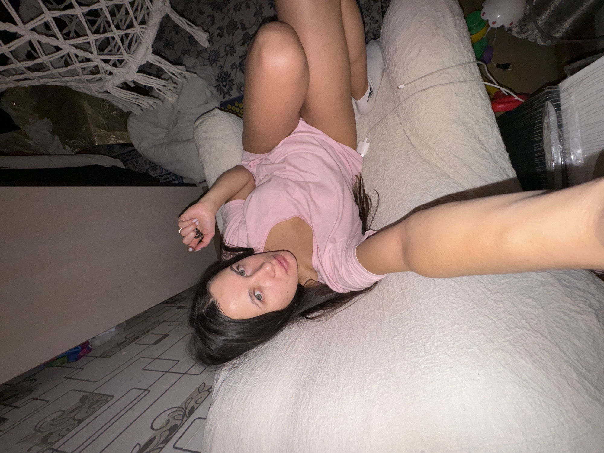 A woman lies on a white textured sofa. She wears a pink t-shirt and white shoes. Her dark hair is spread across the sofa. The room contains a white macrame hanging decoration, assorted objects including a pillow, and a patterned floor. The location is Красный Маяк, Russia.