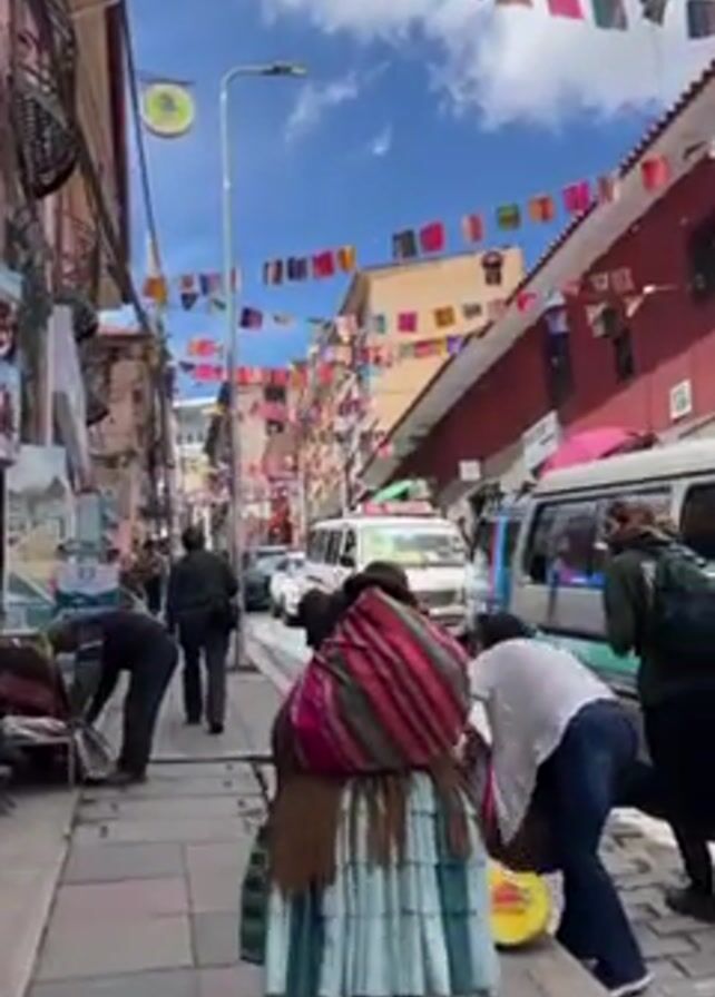 The camera is positioned on a pedestrian sidewalk, looking down a narrow city street. The sky above is partially cloudy. The street is lined with colorful buildings and decorated with strings of colorful square flags or banners strung across the street. The street is filled with moving vehicles, including cars and vans. On the sidewalk, people are walking, standing, and bending over, seemingly examining or working with items on the ground. One woman is wearing a traditional dress and shawl. A man with a backpack walks past her. The sidewalk surface is paved with stones. The general atmosphere seems bustling and lively.