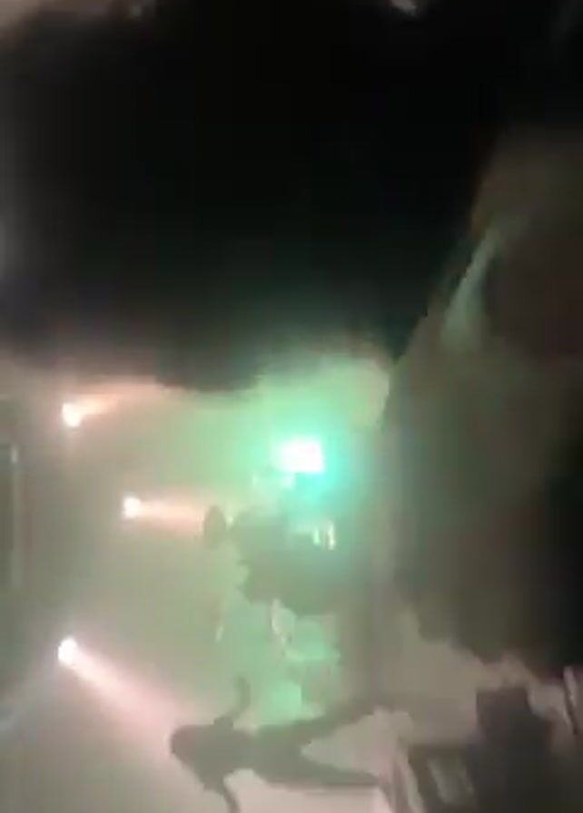 band performing on a stage in a dimly lit venue, likely a concert. The stage is illuminated by several bright lights, some of which are white and green. There is a noticeable amount of smoke or haze in the air, contributing to the overall low visibility. Several people are in the foreground, their figures mostly obscured, suggesting the perspective of someone in the audience. The camera moves, focusing on the stage and then briefly shifting towards the ceiling, which reveals lighting and sound equipment. The overall impression is that the viewer is experiencing the concert atmosphere from within the crowd.