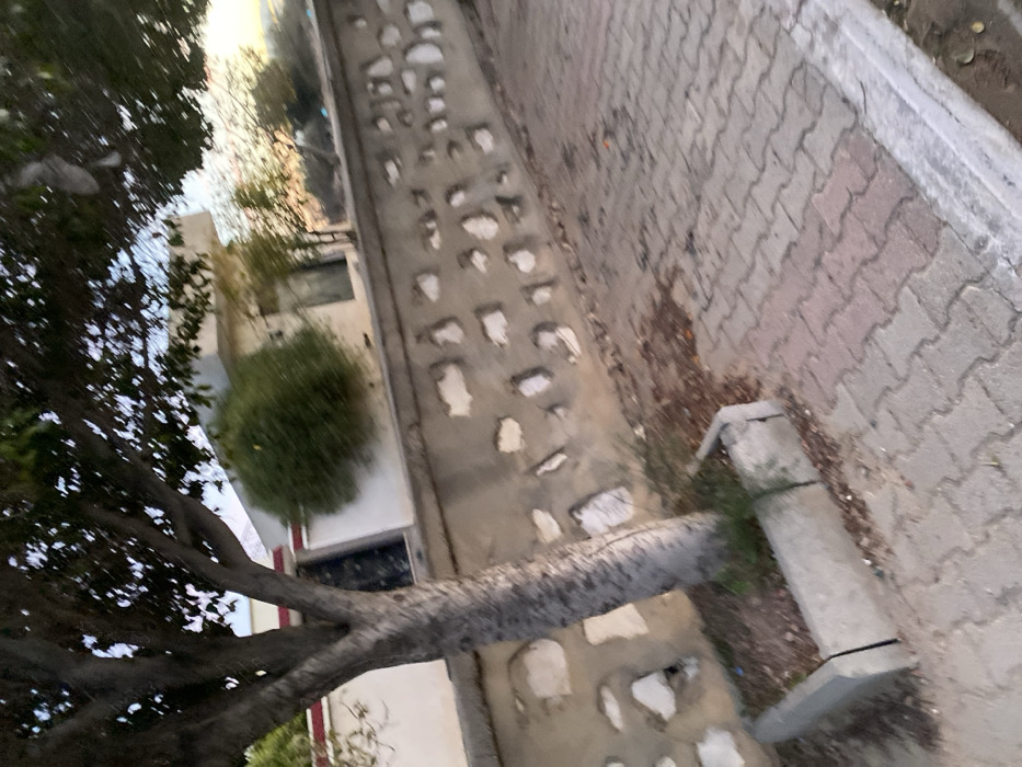 This image depicts an outdoor street scene in Kerker, Tunisia. In the immediate foreground, a paved sidewalk composed of interlocking grey and reddish-brown pavers extends towards the right. To the left, a mature tree with a light grey and brown textured trunk is rooted within a rectangular concrete planter, approximately 0.5 meters in height. Sparse green foliage is visible at the tree's base. Extending horizontally across the midground is a low concrete perimeter wall, roughly 1.5 meters tall, featuring irregularly shaped recesses or embedded lighter-colored stones against its darker grey surface. Behind this wall, a light-colored, multi-story building, possibly residential, is partially visible, flanked by dense green trees and a smaller, rounded shrub. The background shows additional sparse vegetation and a light sky with a subtle warm hue on the horizon, indicating natural daytime illumination. No individuals, animals, or active subjects are present in the frame.