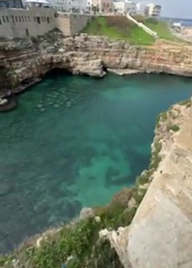 view from a high vantage point overlooking a small beach and cove. The water in the cove is clear and turquoise. The beach is sandy and surrounded by rocky cliffs. There are several people on the beach. The background shows a town with white buildings. The sky is overcast. The camera pans upwards.