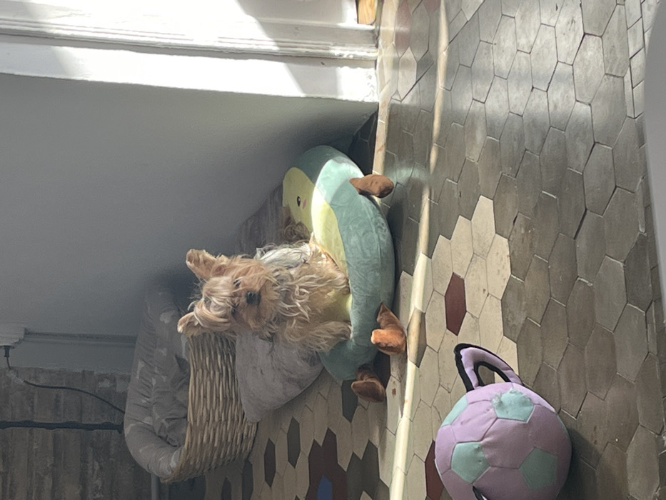 - "An indoor scene in València, Spain, depicts a Yorkshire Terrier dog positioned on a light green, avocado-shaped pet bed with brown plush feet, which itself rests on a larger gray cushion" by FM-pNWBR2, licensed under CC BY 4.0