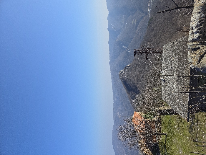 The image presents an elevated, panoramic view of a mountainous landscape near Glozhene, Bulgaria, under a clear, bright blue sky. In the immediate foreground, the top edge of a stone wall is visible on the right, partially obscuring the base of a building with a dark, textured roof, possibly slate or shingle. Numerous bare deciduous tree branches protrude upwards from the foreground, framing this structure. To the left, on a gently sloping, green-patched hillside, stands a building featuring an orange-tiled roof and light-colored walls, surrounded by several bare deciduous trees. A tall, slender white pole with black horizontal stripes is visible behind this building. Centered in the mid-ground, a dark metal lattice-structure transmission tower is present, from which faint, light-colored lines extend. Beyond this, a prominent, pointed peak rises, flanked by multiple layers of bare, tree-covered mountains and hills that recede into the distance, exhibiting a gradual atmospheric haze. No individuals are present, and no actions or interactions are depicted. The scene is static, captured during a season when deciduous trees are defoliated.