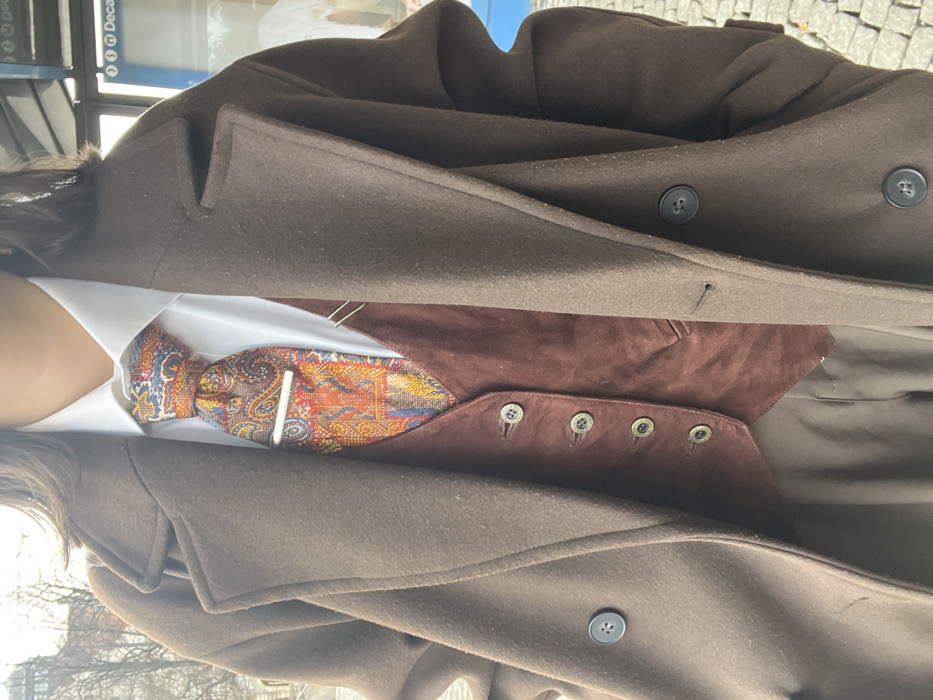 The image depicts an individual's upper torso and head in an urban outdoor setting in Munich, Germany. The person has dark hair and is formally dressed in a white collared shirt, an intricately patterned paisley tie featuring dominant orange, blue, and yellow hues, secured by a silver-toned tie clip. Over this, a dark reddish-brown suede-like vest with four visible brass-colored buttons is worn, beneath an open, dark brown overcoat made of a wool or felt-like material, featuring wide lapels and visible black buttons. Dark brown trousers are partially visible below the vest. The background is blurred, showing faint architectural elements and trees to the left. To the right, a blue and white public information or advertising sign with the partial text "Decaux" is visible, indicating a public transport or street furniture presence. The ground appears to be cobblestone. No specific action beyond standing is observed, and no other individuals are present.
