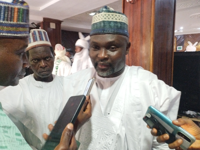 The image depicts a scene of a man being interviewed, likely in a public building. The man, wearing a white long-sleeved robe and a blue and white patterned cap, is being interviewed by a person holding a smartphone. To the man's left, a second man, also wearing a white robe and a cap, is holding a smartphone. The scene takes place inside a building with wooden paneling on the walls. The image appears to have been taken in Kaltungo, Nigeria.