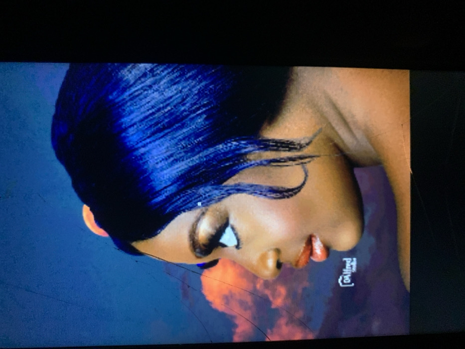 This image is a photograph of a digital display, capturing the right profile of an adult female. She exhibits dark skin and possesses dark blue, short-styled hair, with some strands sweeping forward to frame her face. Her visible right eye is open, enhanced with prominent winged eyeliner and gold-toned eyeshadow. Her full lips are colored with a reddish-orange lipstick and are slightly parted. The background is a vivid, stylized depiction of a sky, transitioning from deep blue at the top to a purplish-pink hue, featuring large, luminous orange-red clouds. A circular, orange celestial body is partially visible behind her head. A white watermark, reading "DA Alfred Studios", is present in the lower-left portion of the background. The photograph itself shows visible screen scan lines, digital artifacts, and what appear to be cracks on the surface of the display from which it was captured. Based on the "DA Alfred Studios" watermark, the original portrait is attributed to Jos, Nigeria.