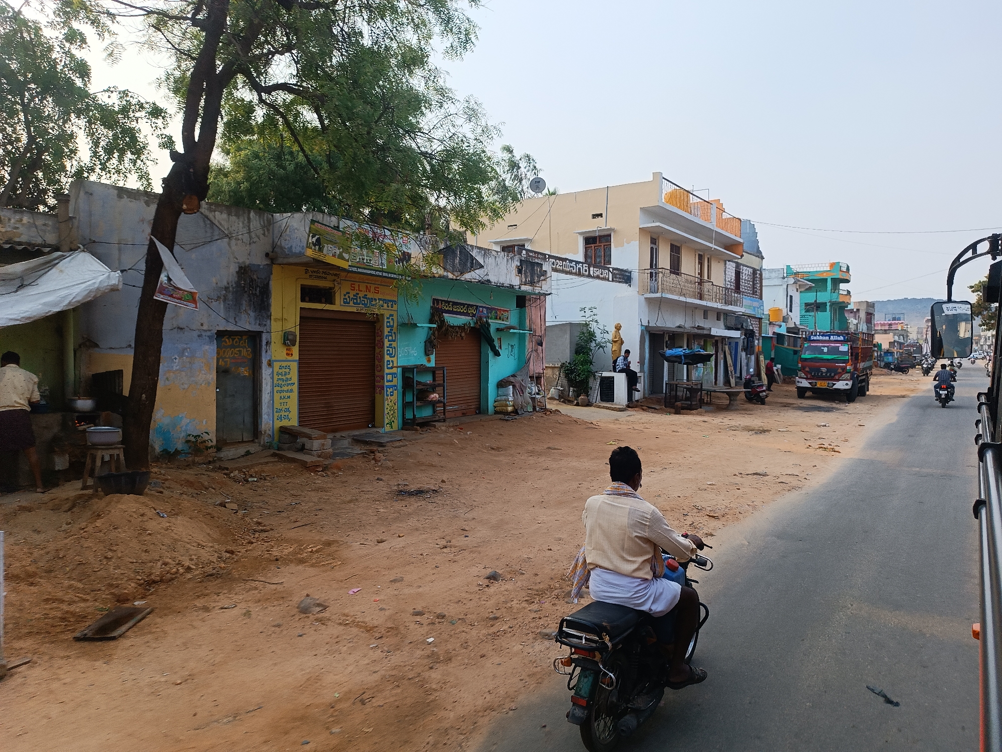 The image depicts a street scene in Kothacheruvu, India. In the foreground, a man is riding a motorcycle on the right side of the road. The road is partially paved, with a dirt shoulder on the left. Along the left side of the street are several buildings, some with closed storefronts. One building features a sign in Telugu advertising animal feed, including cotton seed cake from S.L.N.S. and S.K.M 777 brands. Other buildings have signs for "Sri Kiran General Store" and "Suresh". In the background, a truck with "Subhan Allah" written on it is visible, along with other vehicles and buildings. A tree is present near the storefronts on the left.