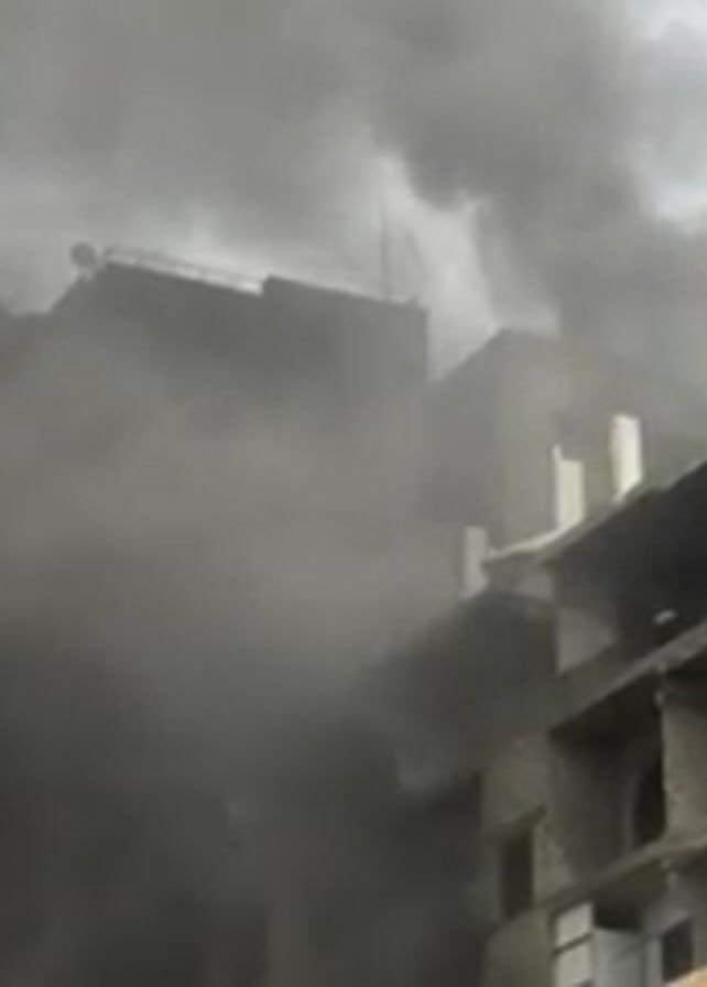 partially destroyed building engulfed in dark smoke. The building's structure is visibly damaged with exposed concrete and missing walls. Smoke billows from within the building and obscures a portion of its facade. The sky is overcast, adding to the somber atmosphere. The scene suggests a recent explosion or fire.