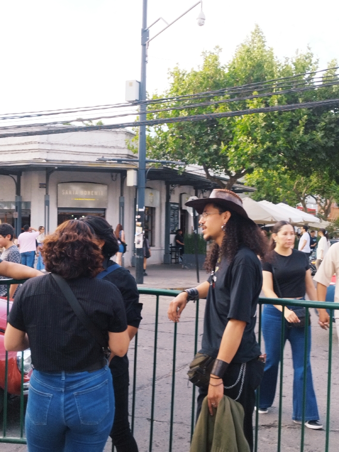 A gathering of people stands near a green fence. In the foreground, two women wear black shirts and blue jeans. A man with long curly hair, a black t-shirt, black pants, and a brown cowboy hat leans on the fence. Behind him, a woman in a black t-shirt and blue jeans is walking by. A building with a sign that reads "Santa Bohemia" is visible. A tall green tree and overhead wires are in the background.