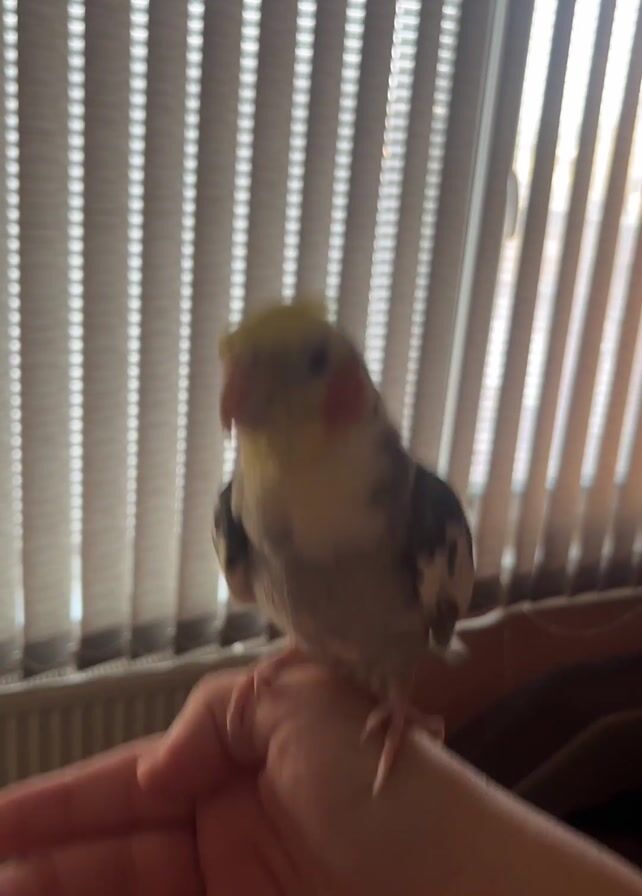 cockatiel perched on a person's hand. The bird has gray and yellow plumage, with reddish-orange cheek patches. The person's hand is pale, and the bird is facing the camera. In the background are vertical blinds covering a window. There is also a radiator visible. The bird appears to be preening or adjusting its feathers. The camera is unsteady and slightly out of focus.