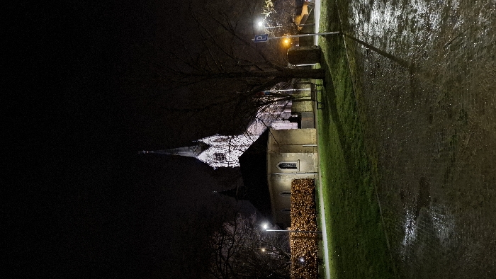 At night, a church with a tall spire stands illuminated against a dark sky. Light reflects off its white facade, contrasting with the surrounding darkness. To the right, a building extends from the church, with a well-lit wall beside a manicured hedge. A wet path and green lawn complete the scene, with streetlights casting their glow in the background. The image is turned sideways.
