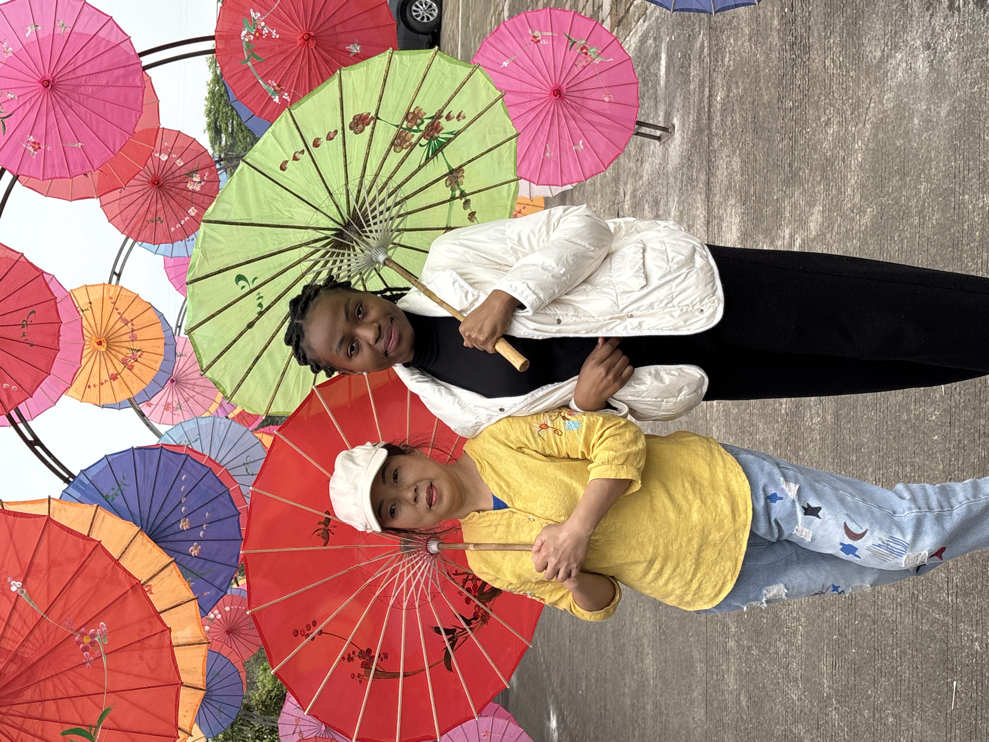 Two women pose with traditional paper parasols in Xianfeng, China. The woman on top is Black, wearing a white quilted jacket over a black top and pants. She holds a green parasol with floral decorations. The woman below is Asian, wearing a yellow shirt, blue jeans with colorful patterns, and a white cap. She holds a red parasol with floral decorations. The background is filled with colorful paper parasols of various colors suspended above the ground, creating a canopy effect. The ground appears to be concrete.
