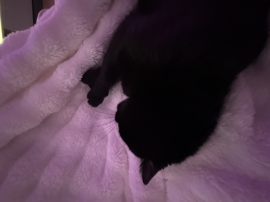 A black cat rests on a plush, white blanket. The cat's face, though partially obscured by shadow, reveals whiskers and a pointed ear. A paw with visible toes extends onto the blanket. The lighting gives the scene a soft, violet hue, highlighting the fluffy texture of the blanket.