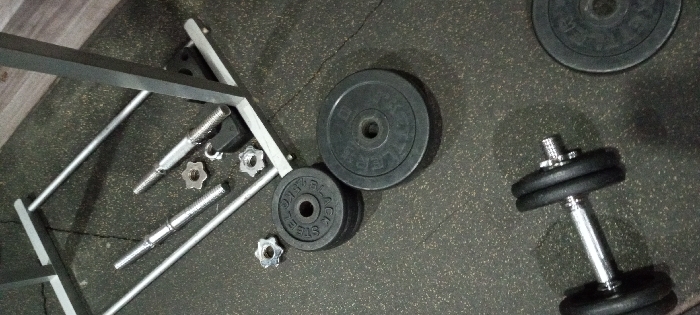 - "The scene depicts various weightlifting components on a dark, textured rubber floor, consistent with an indoor exercise area in Aral, Kyrgyzstan" by FM-4c8dY2, licensed under CC BY 4.0