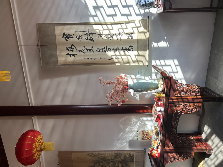 An indoor shot showcases a traditional Chinese interior. Calligraphy hangs on the wall above a brown wooden table adorned with a light green vase containing pink blossoms. Below, a painting is partly visible. A red Chinese lantern hangs from the ceiling. The room is illuminated by sunlight streaming through a lattice window, creating intricate patterns on the wall and furniture.