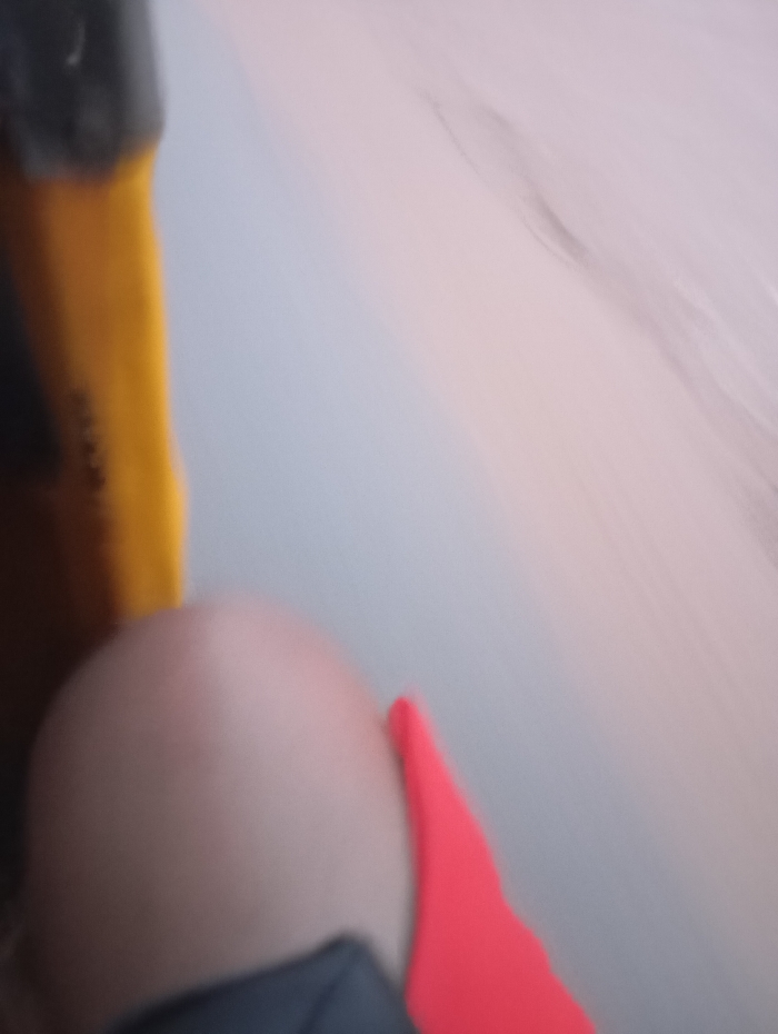 A close-up shot reveals an undefined, blurry scene. A fleshy, round form, potentially a limb, occupies the lower left quadrant, juxtaposed with a vibrant red shape. Adjacent to the round form is a dark, unidentifiable object. The background is a smooth, gradient expanse of white, softly blending into pale peach tones. A strip of yellow with small black details is visible in the top left. The overall lack of focus suggests motion or intentional blurring.