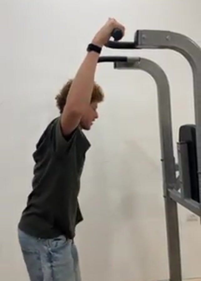 A young man with curly brown hair is shown from the side as he performs a pull-up on a pull-up bar