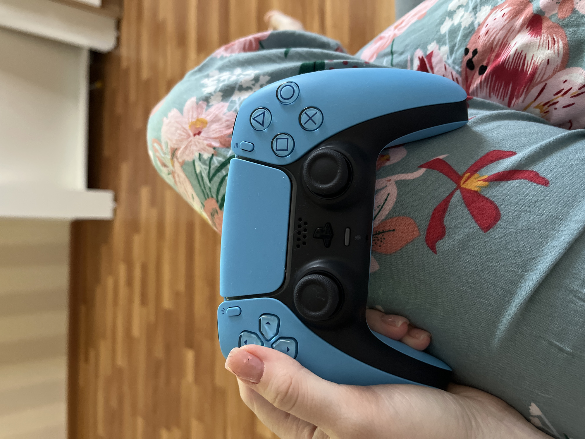A person is holding a blue and black Playstation 5 DualSense controller. The controller is positioned in the center of the image. The person is wearing a patterned shirt or pajamas with floral designs. The background features a wooden floor and a partially visible white cabinet. The location is not specified and therefore the city of Chaikovsky, Russia cannot be confirmed based on this image alone.