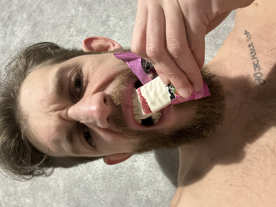 A close-up shows a bearded man with an intense expression, his face tilted sideways. He is holding a partially eaten, white-covered, pink-filled snack bar in his mouth, still encased in its pink wrapper. A tattoo is visible on his upper right chest. The background is a textured gray surface.