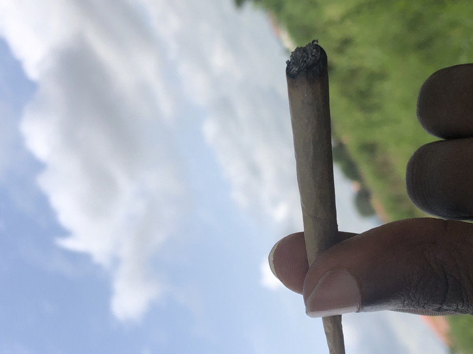 A dark-skinned hand holds a partially burnt, hand-rolled cylindrical object resembling a cannabis joint or hand-rolled cigarette
