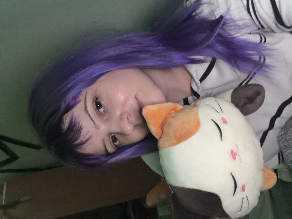 - "A woman with purple hair and dark brown eyes poses with a stuffed cat" by FM-3WDDJ2, licensed under CC BY 4.0