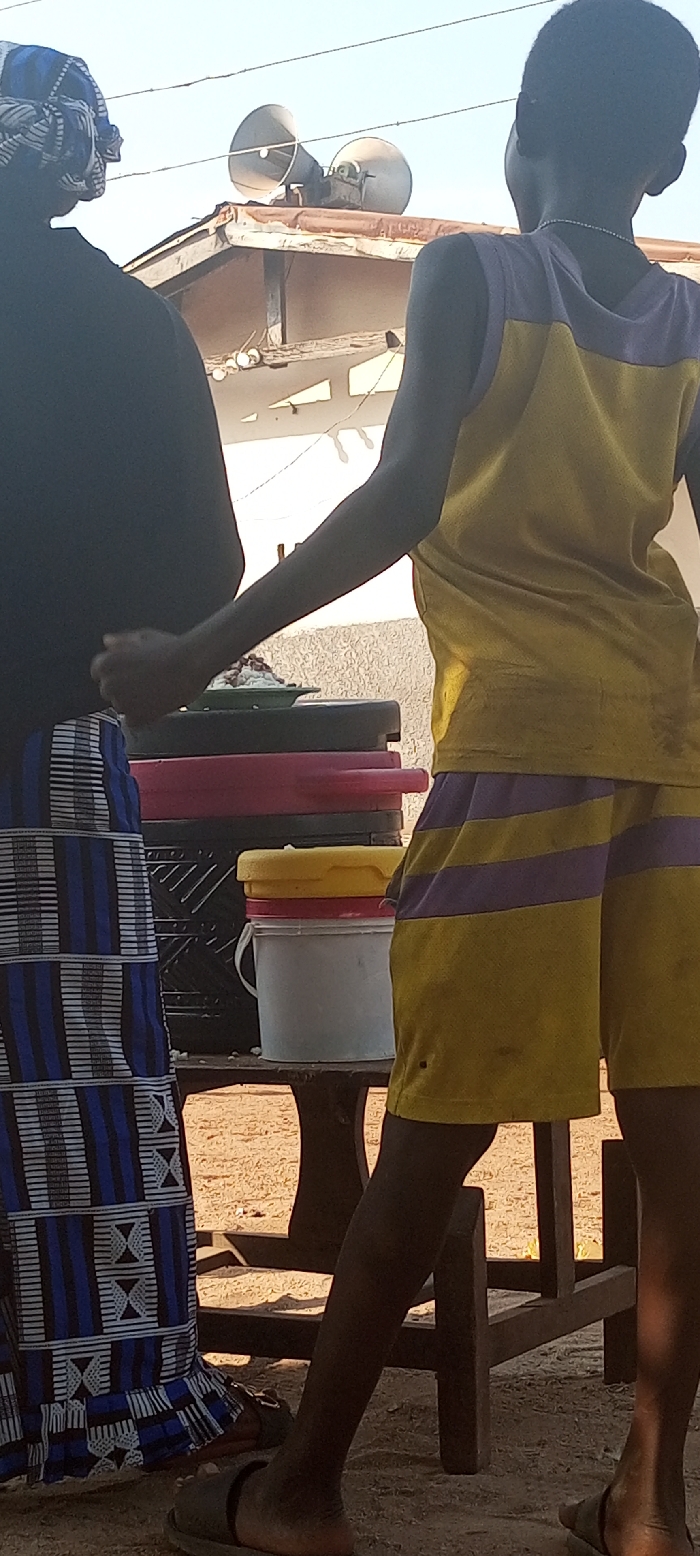 This image depicts an outdoor scene in Doma, Nigeria, under a clear sky. In the foreground, two individuals are partially visible from the back. On the left, an adult, likely female, wears a dark top, a blue, white, and black patterned fabric wrapper or skirt, and a patterned headwrap. Her left arm is bent, hand partially obscured. She wears dark sandals. To the right, a younger individual, likely male, wears a yellow sleeveless top with a purple horizontal stripe, and yellow shorts with multiple purple horizontal stripes. A thin, light-colored necklace is visible around his neck. He wears dark sandals and faces right. Between the two individuals, on a dark wooden stool or low bench, are several stacked items. From bottom to top, these include a white cylindrical plastic bucket with a red lid, topped by a yellow plastic lid, followed by a black textured plastic container, and a red plastic container. Resting on the topmost container is a green plate holding a pile of what appears to be a food mixture, possibly rice and beans. In the mid-ground, a light-colored building wall with some dark markings is visible. Above the building, on a corrugated rooftop, two large, grey horn-type loudspeakers are mounted on a support structure. Multiple thin, dark overhead wires traverse the upper portion of the frame. The ground appears to be uneven, light brown earth.