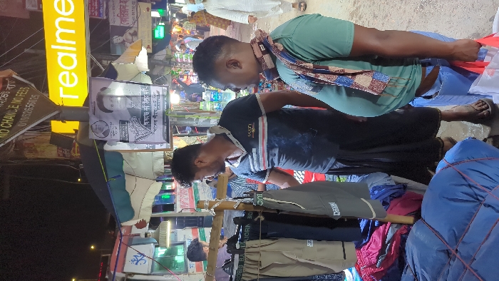 Two men browse clothing at a roadside stall. The stall has a variety of clothes, including gray pants and blue garments. Above the stall, there is a Realme sign and posters with text in Bengali. The man on the right wears a green shirt, blue jeans, and a patterned scarf. The man on the left wears a navy blue shirt with white stripes.