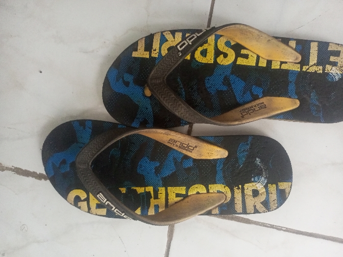 Two worn Ando-brand flip-flops are positioned on a light-colored tiled surface in Zee Pin Kone, Myanmar