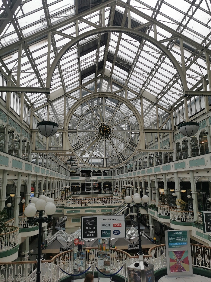 The image displays the interior of the St. Stephen's Green Shopping Centre in Dublin, Ireland. The scene captures a multi-level atrium characterized by an ornate glass and steel arched roof structure, allowing natural light to enter. A prominent feature is a large circular clock integrated into the glass facade at the far end of the atrium. The shopping center features several floors visible, with white and green decorative balustrades lining the walkways. Numerous white, globe-shaped lampposts are positioned on the upper levels and a hanging spherical lamp is suspended from the ceiling. Retail signage is visible, indicating "Top O' The Green," "Middle Floor," "First Floor," and store names such as "Dunnes," "TK Maxx," and "Boots." Escalators are discernible between levels. The floor of the atrium features various kiosks and displays. A single individual is partially visible at the bottom center, obscured by a display or railing. The overall environment appears clean and well-maintained.