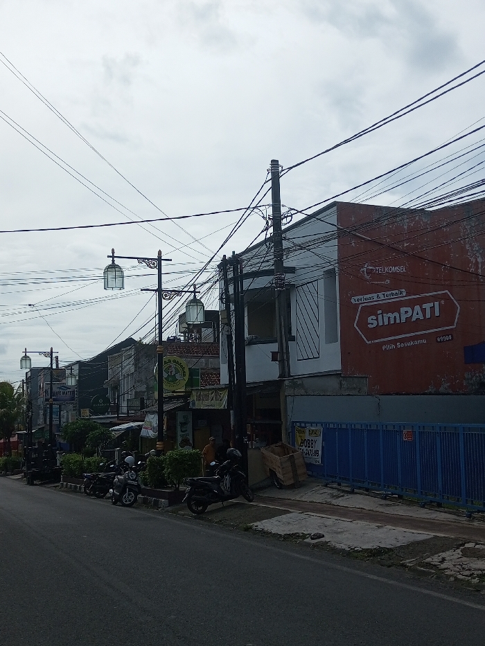 A street scene shows motorcycles parked along the side of a road, near a mix of buildings and shops. Electrical lines crisscross the sky above. The buildings vary in design, some with signage like "TELKOMSEL" and "simPATI". There are also ornate street lamps with caged lanterns. The sky is overcast.