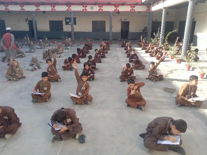 The image displays an outdoor classroom activity taking place in a school courtyard within Quetta City Tehsil, Pakistan