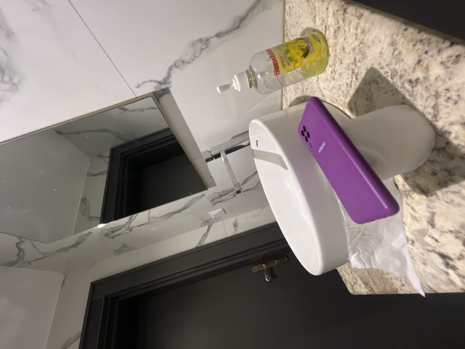 A bathroom countertop displays a bottle of "Sunshine" hand soap, a white sink, and a purple Samsung phone resting on paper towels