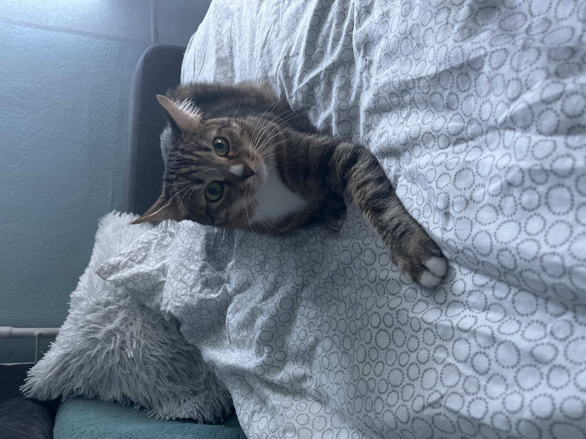 A tabby cat with green eyes and a white patch on its chest is lying on a bed with a patterned white and gray duvet cover. The cat's head is tilted towards the viewer, and its front paw is extended. A gray fluffy pillow is visible on the left side of the image, and a teal-colored cushion and gray chair are in the background. The wall behind the chair is blue-gray. The environment shows it is an indoor scene. There is no evidence to suggest this photo was taken in Izhevsk, Russia.